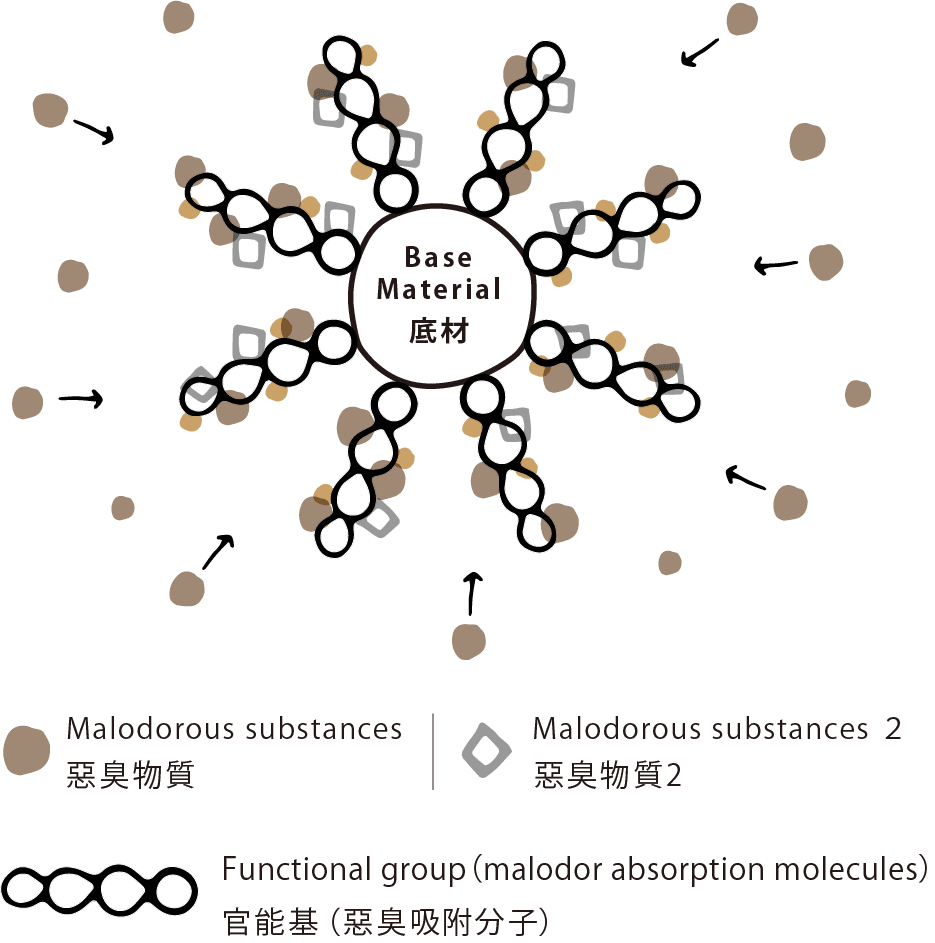 接枝共聚物(graft polymer)是利用專利技術製作出的聚合高分子,這種特殊的除臭成分具有能應付各種臭味的官能基,能做到以往的除臭劑難以做到的,將酸性、鹼性與中性等性質各異的惡臭同時變為無害,並且在乾燥穩定後持續作用。